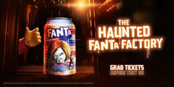Coca-Cola’s Fanta is rolling out a Halloween campaign across multiple markets. The centerpiece: a live “Haunted Fanta Factory” experience in New York from October 29–31, themed with horror icons (Chucky, M3GAN) through collaborations with Universal Pictures and Blumhouse. Limited-edition cans will feature movie character designs, and themed promotions will run at AMC theaters and globally.